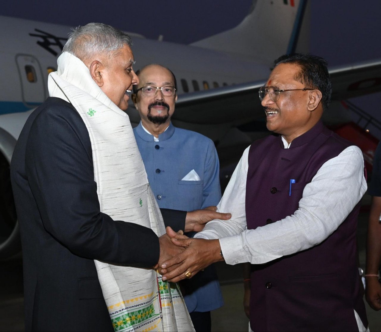रायपुर |उपराष्ट्रपति जगदीप धनखड़ आज शाम स्वामी विवेकानंद एयरपोर्ट रायपुर पहुंचे। राज्यपाल रमेन डेका, मुख्यमंत्री विष्णु देव साय ने एयरपोर्ट पर उपराष्ट्रपति जगदीप धनखड़ का आत्मीय स्वागत किया। इस अवसर पर उपमुख्यमंत्री अरुण साव, सांसद बृजमोहन अग्रवाल, विधायक सर्व पुरंदर मिश्रा, इंद्र कुमार साहू, गुरु खुशवंत साहेब, अनुज शर्मा ने भी उपराष्ट्रपति का पुष्प गुच्छ भेंटकर स्वागत किया।