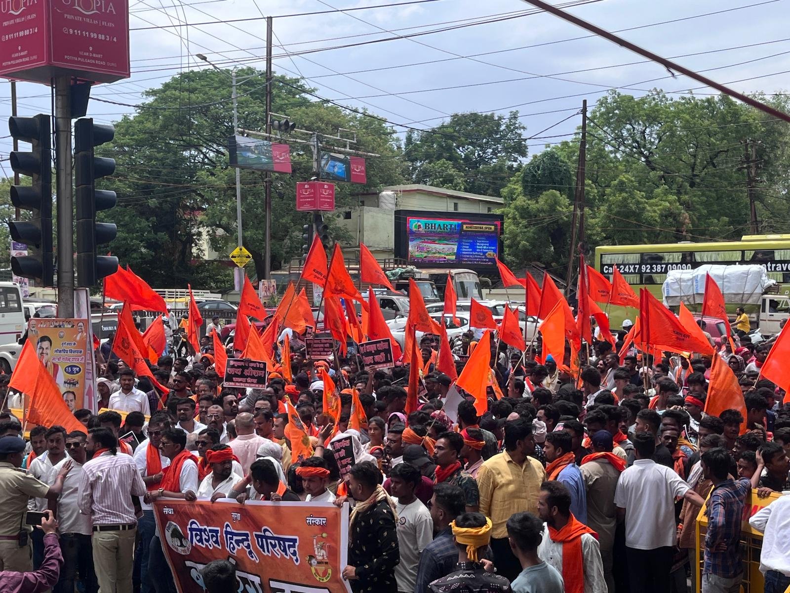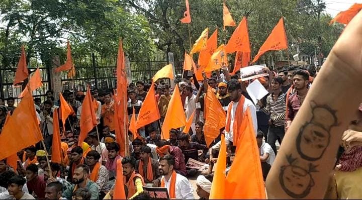दुर्ग – विश्व हिंदू परिषद बजरंग दल द्वारा आज कलेक्ट्रेट का घेराव कर ज्ञापन सौपा जिसमे कलेक्टर महोदया को ज्ञापन सौंपकर प्रमुख बिंदुओं पर चर्चा की गई । पाकिस्तान जिंदाबाद ,सर तन से जुदा के नारे लगाने वालो को चिन्हित कर उन पर कड़ी से कड़ी कार्यवाही की जाए।. सुनवाई के दौरान कोर्ट परिसर में मुस्लिम समुदाय द्वारा जानलेवा हथियार लेकर जाना एवम कोर्ट के निर्णय की अवहेलना करते हुए पुष्पराज पर हमला करने दौड़ना।. पिछले पांच वर्षो में जो मुस्लिम बस्तियां बसी है उनकी जांच कर उन बस्तियों में रह रहे व्यक्तियों के आधार कार्ड की भी जांच हो कि कहीं वह रोहिंग्या बांग्लादेशी तो नही है ।इन तीन सूत्रीय माँगो को लेकर विहीप प्रांत सह मंत्री घनश्याम चौधरी जी, प्रांत सह मंत्री नंदूराम जी साहू, बजरंग दल प्रांत संयोजक ऋषि मिश्र जी, विभाग मंत्री अनिल सिंह गुर्जर जी, विभाग संयोजक शैलेंद्र सोनी, सह संयोजक राकेश तिवारी, जिला कार्यकरणी मनीष बुचासिया, पारस जंघेल, ऐश्वर्य सोनी, ठाकुर निहाल, बबलू सिंह, विमलेश तिवारी, प्रवीण रामरेड्डी, सौरभ देवांगन, खेमलाल सेन, टिक्कू निषाद, पिंटू जाल, आदित्य सिंह, जीवेश उपाध्याय, जितेश सिंह, सुनील वैष्णव, राजीव चौबे, सजन श्रीमाली, बलदाऊ साहू, नरसिंग सिन्हा, आशुतोष तिवारी, इंद्रजीत सोनकर, महेश यादव, शुभम चिंचुलकर, हरिदास वैष्णव, राम बिहारी, महेश नायडू, जसमीत सिंग, पुष्पराज राजपूत, राजेश यादव,भावेश चावड़ा, बबलू, युवराज, मिलाप, खिलावन पार्थी, वरुण निषाद के साथ हज़ारो की संख्या में कार्यकर्ता उपस्थित थे।