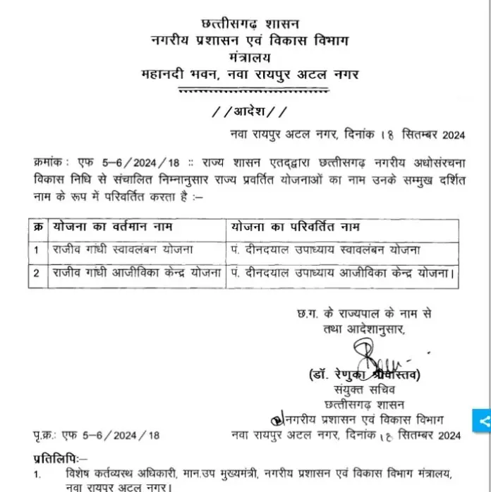 रायपुर। छत्तीसगढ़ में राजीव गांधी स्वावलंबन योजना अब पं. दीनदयाल उपाध्याय स्वावलंबन योजना के नाम से जानी जाएगी। मुख्यमंत्री विष्णुदेव साय की सरकार ने इसके साथ ही राजीव गांधी के नाम पर चल रही एक और योजना का नाम भी बदलने का निर्णय लिया है।