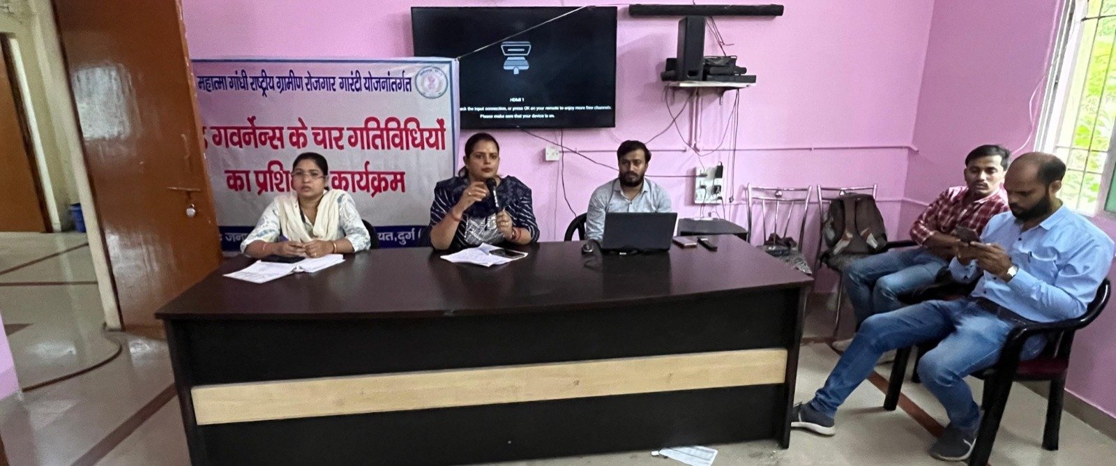 दुर्ग| भारत सरकार, ग्रामीण विकास मंत्रालय, ग्रामीण विकास विभाग, महात्मा गांधी नरेगा डिविजन, नई दिल्ली सेे प्राप्त दिशा-निर्देश के अनुसार मुख्य कार्यपालन जिला पंचायत दुर्ग के मार्गदर्शन में गुड गवर्नेस इनिशियेटीव अंतर्गत ब्लॉक दुर्ग में प्रशिक्षण कार्यक्रम आयोजित किया गया। जनपद पंचायत दुर्ग कार्यक्रम अधिकारी श्रीमति गौरव मिश्रा मनरेगा ने प्रशिक्षण के दौरान जानकारी दी कि महात्मा गांधी नरेगा के अंतर्गत ग्राम पंचायत स्तर पर गुड गवर्नेस इनिशियेटीव के रुप में ‘‘जॉब कार्ड, 7-रजिस्टर, वर्क फाईल के संधारण तथा कार्यस्थलों पर नागरिक सूचना पटल के निर्माण के लिए सांकेतिक अथवा सुझावात्मक फ्रेमवर्क एवं बुकलेट जारी कर प्रशिक्षण कार्यक्रम का आयोजन किया गया।