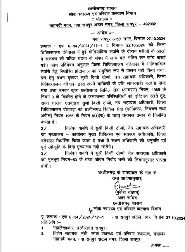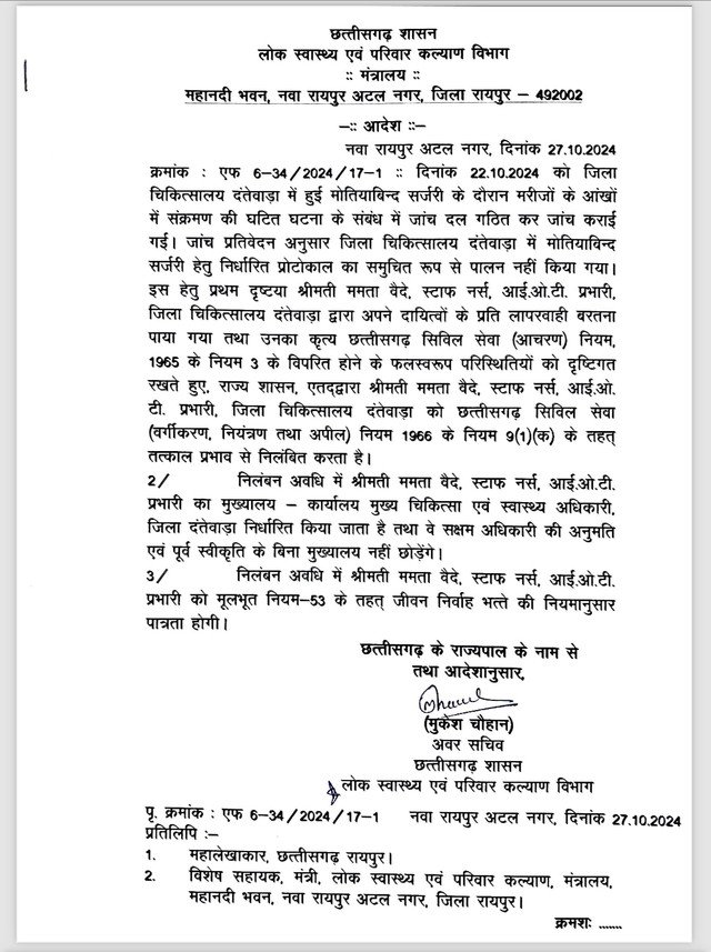 नेत्र सर्जरी के दौरान मोतियाबिंद सर्जरी के निर्धारित  प्रोटोकॉल का समुचित पालन नहीं किए जाने के कारण राज्य सरकार ने कठोर कदम उठाते हुए प्रथम दृष्टया दोषी पाए  जाने पर डॉ गीता नेताम नेत्र सर्जन जिला चिकित्सालय दंतेवाड़ा को निलंबित कर दिया है। इसके साथ ही कार्य के प्रति लापरवाही बरतने पर नेत्र सहायक अधिकारी सुश्री दीप्ति टोप्पो और स्टाफ नर्स ममता वैदे को भी निलंबित किया गया है।