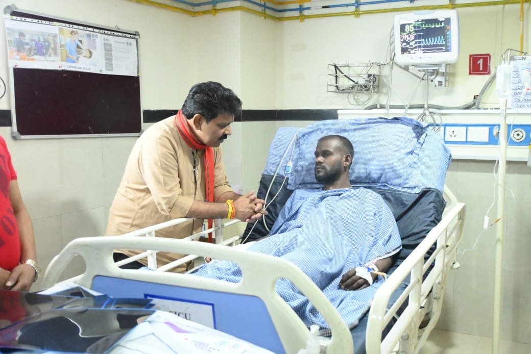 रायपुर | नक्सलियों से मुठभेड़ में घायल डीआरजी के जवान  रामचंद्र यादव से मिलने उपमुख्यमंत्री  विजय शर्मा देर रात राजधानी रायपुर के  नारायणा अस्पताल पहुंचे। इस दौरान उपमुख्यमंत्री ने घायल जवान से उनका हालचाल जाना। उप मुख्यमंत्री  शर्मा ने घायल जवान से घटना की जानकारी भी ली।