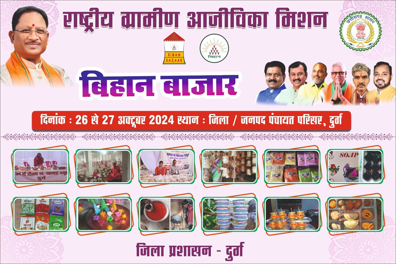 दुर्ग| कलेक्टर सुश्री ऋचा प्रकाश के मार्गदशन में 26–27 अक्टूबर 2024 को जिला पंचायत दुर्ग परिसर में बिहान मेला का आयोजन किया जा रहा है। ग्रामीण क्षेत्र की स्व-सहायता समूह की दीदीयों द्वारा विभिन्न प्रकार के उत्पादन व सामग्रियों का निर्माण कर उन्हें विक्रय किया जाता है। जिला पंचायत समूह की दीदियों को इस कार्य के लिए प्रोत्साहित करने में सहायता करता है। जिला प्रशासन द्वारा ग्रामीण क्षेत्रों सेे उत्पादों को शहर तक लाने की मुहीम चलाई जा रही है। जिससे ग्रामीण स्व-सहायता समूह की दीदियां आत्मनिर्भरता की दिशा में आपना कदम बढ़ा रही है।