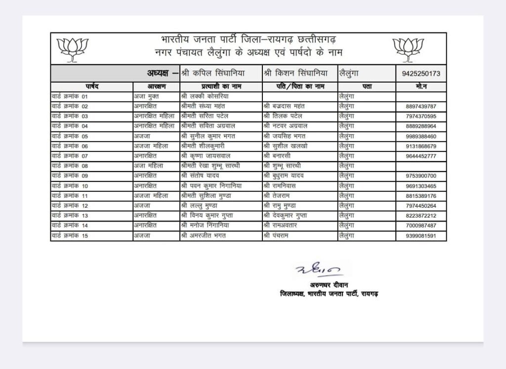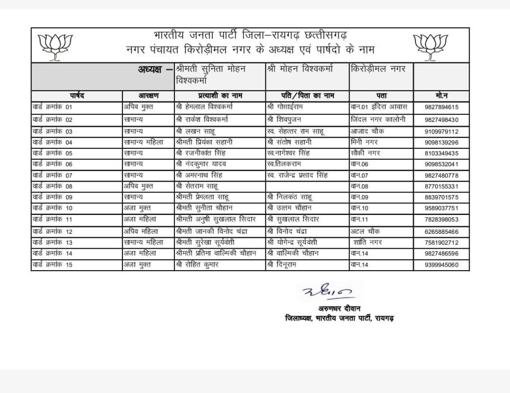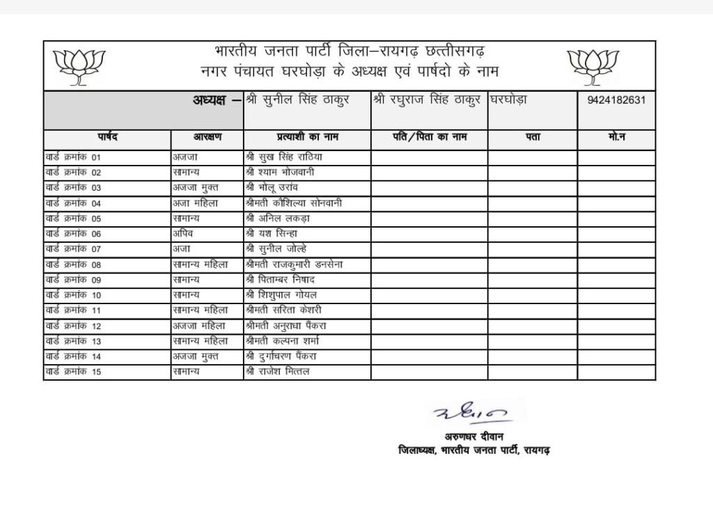 Brek : रायगढ़ में नगर पंचायत अध्यक्ष व पार्षद कैंडिडेट लिस्ट जारी, भाजपा ने किरोड़ीमल नगर, लैलूंगा , घरघोड़ा व खरसिया के प्रत्याशियों के नाम पर लगाई मुहर