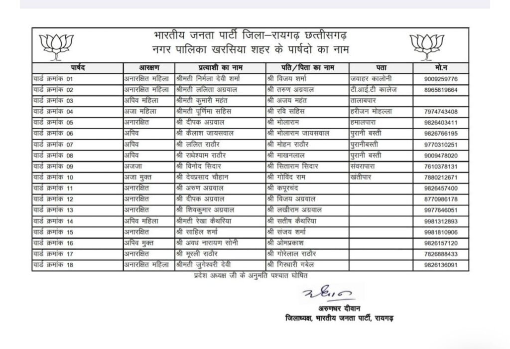 खरसिया के पार्षद प्रत्याशी और लैलूंगा, किरोड़ीमल, घरघोड़ा के पार्षद एवं अध्यक्षों की सूची हुई जारी