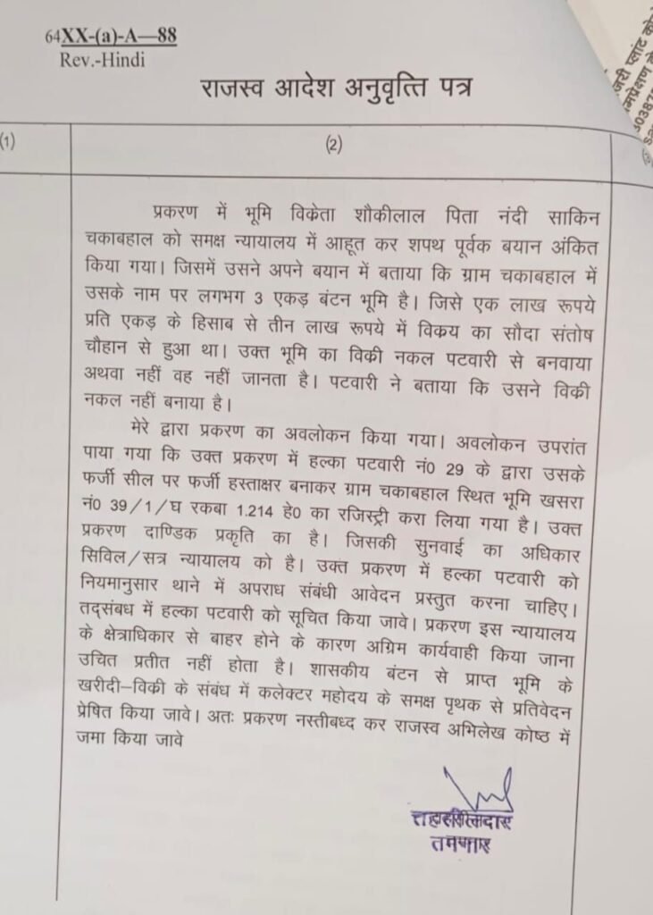 फर्जी हस्ताक्षर कर शासकीय जमीन की बिक्री करने वाले अपराधियों को पटवारी वेदराम पटेल दे रहे संरक्षण